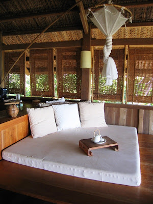 The eco-friendly resort has a Robinson Crusoe luxe feel – it uses natural materials wherever possible and blends into the surrounds – everything’s bamboo and wood, including the gorgous stand-alone tub in the open-air bathroom.