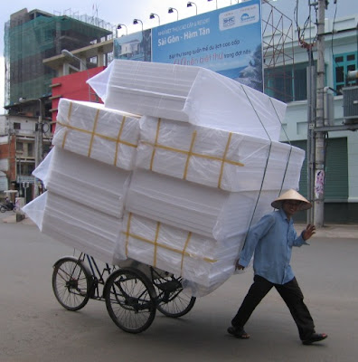 Sights like these were common in Cambodia, but I haven’t seen too many overloaded cyclos or makeshift vehicles joining the motorbiking masses on Saigon’s heaving streets. I saw this guy while walking through District 3 and couldn’t resist taking a pic – he waved just at the right moment!