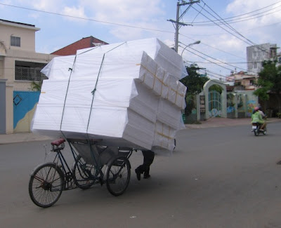 In Cambodia – pretty much daily you’d see something similar!! My favourite crazy sight in Phnom Penh’s traffic though were Sambo the elephant on his daily walk and the oxcarts from Kampong Cham province loaded up with pottery wares.